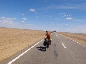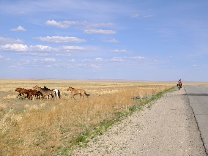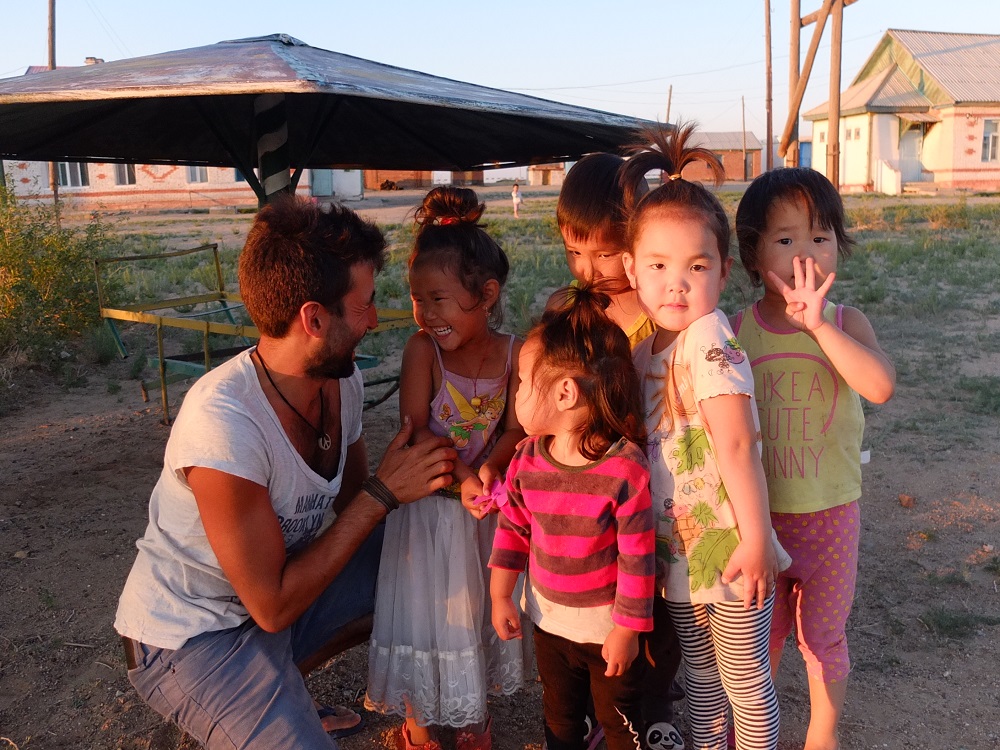 Un piccolo cavallo mongolo lecca la criniera della sua amica e lei, giocosa, gli trotta intorno strisciando la coda nel suo mantello liscio. Io e Marco abbiamo la pelle bruciata e dura, le nostre ombre sull’asfalto sembrano di cavalieri erranti su piccoli pony carichi e stanchi. Mi accovaccio per terra per mangiare qualcosa. Due bimbe e un fanciullo poco più grande si avvicinano. Hanno corso allontanandosi dal loro magro gregge di pecore per salutarci. Il maschietto gioca al cowboy e io sorrido pensandolo già promesso sposo a una delle due pastorelle. Queste terre pur non offrendo tanto, lo faranno innamorare e quasi sicuramente sarà l’unica amica vicina di tenda la fortunata.